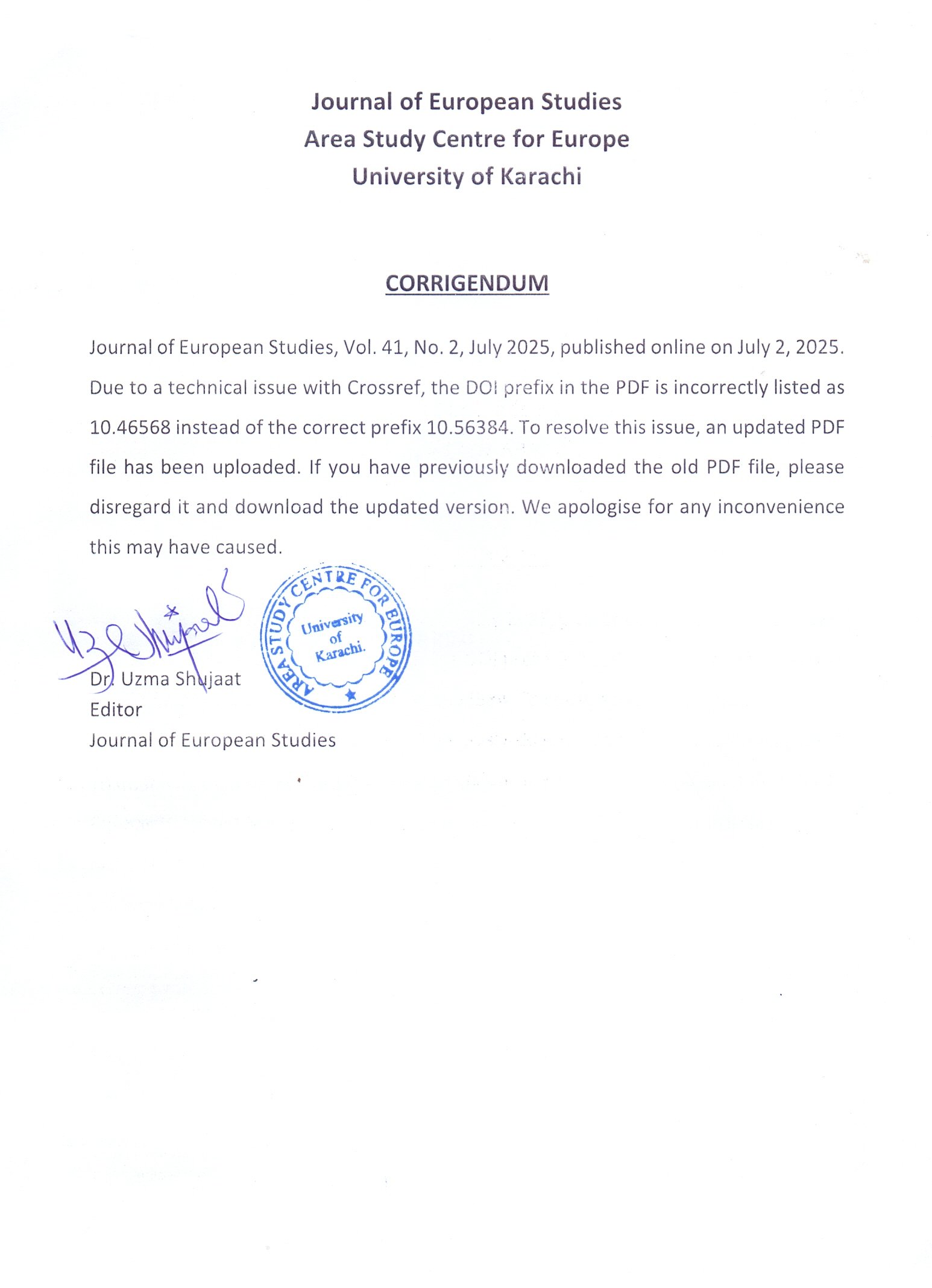 The Journal of European Studies (JES) is HEC recognized 'Y' category Journal. The Area Study Centre for Europe, University of Karachi undertakes research at M.Phil. and Ph.D. level. The bi-annual Journal of European Studies publishes articles on contemporary European issues and interdisciplinary policy and issues of the contemporary world. The objective of the Journal of European Studies is to focus its research specifically on the EU, its politics, economics, CFSP and external relations, including Pak–Europe relations, China–Europe, Europe–Middle East, European responses on contemporary issues and Climate Change Management. The Editor of the Journal of European Studies invites academics, scholars and policymakers, experts and students in the relevant field to contribute their articles for publication in the upcoming issue of the Journal (January 2026).